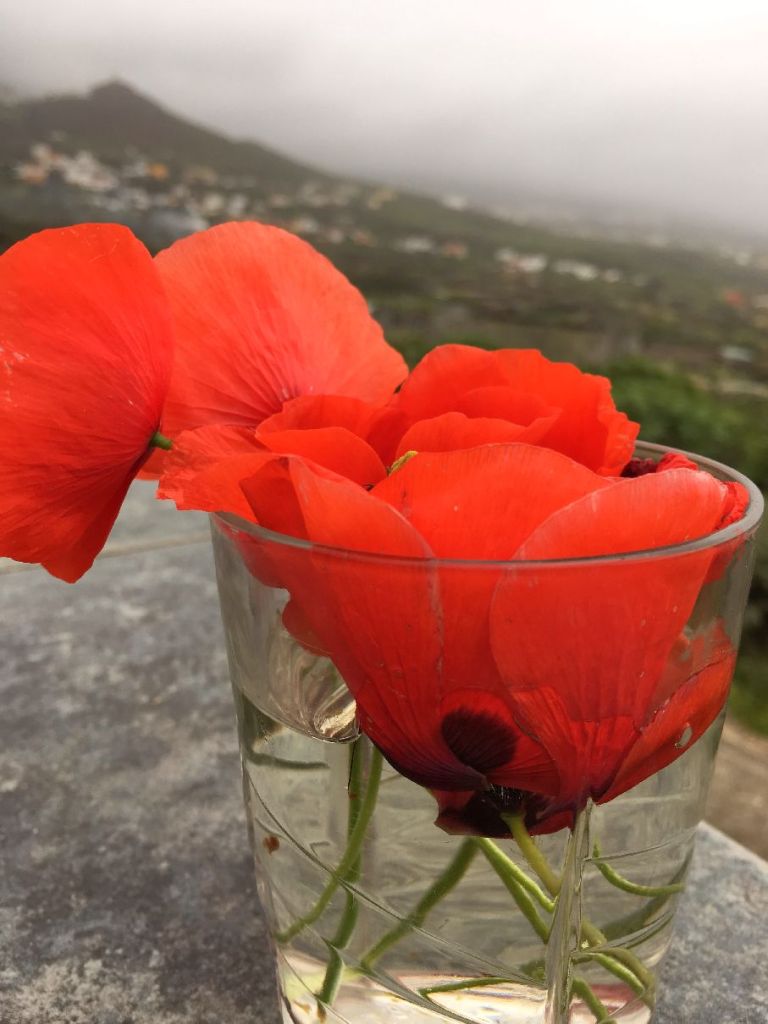 Rytas atskleidė grožį, kurį nuslėpė tamsa. Priešais – vandenyno platybės, o už namuko – kalnų grandinė. Mes – papėdėje, o pasigilinus išsiaiškinau, kad UGNIKALNYJE, tiksliau jo įgriuvusioje dalyje, kuriai pavyko likti virš vandens po to, kai 2 km aukščio vulkanas skilo ir kartu su trečdaliu salos nugarmėjo vandenin per siaubingą žemės drebėjimą. Galit įsivaizduoti kas čia darėsi kai tai vyko? O 100 metrų tsunamio bangas pasekoje? Taigi. Atsibudome Atlanto vandenyno viduryje ant uolėtų sausumos liekanų nuolat šniojamų bangų. Vaizdas ir jausmas – stulbinantis, o tas rūkas neleidžiantis matyti kalnų viršūnių nepaprastai paslaptingas ir baugus. Visai ne Tenerifė. Visai kaip NIEKAS ką esu mačiusi. Rūkas lydėjo visos kelionės metu, atrodė kad jis čia toks pat natūralus, kaip juodos uolos, juodi namai, juodas lavos dirvožemis. Rūkas kaip šydas, kaip nuolat kybantis debesis. Bet gali būti, kad tuo metu Tenerifėje viešėjusi calima***, pasiekė ir El Hierro. Tas RŪKAS nudažė visą mūsų kelionę ir niekaip kitaip negalėčiau prisiminti El Hierro. Rūkas – salos dalis. Taip pat kaip aguonos. Įsivaizduokite tokį derinį: juodos aštriabriaunės UOLOS, krentančios žemyn į purslais besitaškantį vandenyną, raudonos AGUONOS, tokios geibios ir TOKIOS gražios, kad vidurius suspaudžia, plius RŪKAS ir atšiaurus drąskantis vėjas.