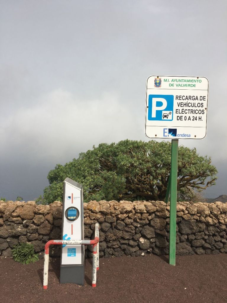 Elektrinių automobilių pakrovimo stotelė..Gražus planas – iki 2020 m saloje naudoti TIK e-auto… Deja, 2018 m mes nei vieno tokio TEN nematėme…