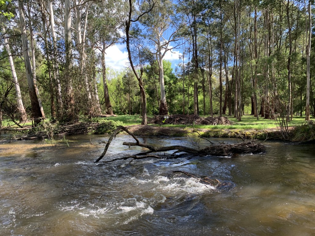Srovė didelė, pagavo kaip mat. Pirma mintis: „na, čia gamta, matyt, kengūros maudosi tuose vandenyse, juk nešoktų srovėn nežinodama ką daro?!…“ Mažas gyvūnėlio sknukutis vos kyšojo plakamas vandens, upėje pilna šakų ir sūkurių, tai panyra, tai išlenda, mes persigandę sekam palei krantą, neša srovė labai greitai. Kengūra bando pasiekti krantą (priešingą nei tas, kur mes panikuojam), priplaukia, bet krantas paplautas smarkių liūčių, medžių šaknys kabo ir trukdo jai net pradėti gelbėtis. Matom, kad niekaip ji ten neišlips ir kad čia ne tas variantas, kur kengūra maudosi, nes žino ką daro… 😟 Jonas staigiai lenda vandenin, užsiropščia ant didelio rąsto ir pereina į kitą krantą, kengūra išsigąsta artėjančio dvikojo ir leidžiasi nešama srovės tolyn nuo kranto. Vanduo ją pakiša po didžiuliu rąstu, bet laimei ji išnyra kitoje pusėje, aš lekiu vienu krantu, Jonas kitu. Per vidurį, upėje, nedidelė sekluma, ten sunešta daug akmenuku ir aš mintimis ir judesiais (realiai rankomis ariu orą) genu tą vargšą gyvūnėlį ant tos brastelės. Ir, žinokite, PAVYKO (matyt žiauriai gerai mojavau rankomis)!!! Ji užstringa ant tų akmenukų, pusę kūno dar smarkiai tempia garmantis vanduo, bet galva ant akmenų. Aš pasiekti jos negaliu, per toli ir per gilu. Upės dugnas neaiškus ir pilna įvairiausių sąnašų. Jonas lenda vandenin nuo kito kranto, gylis ten dar ok, siekia užpaklį, jis atsargiai sėlina, kad leisgyvė kengūra neišsigąstų ir užėjęs iš už nugaros užmeta ant jos savo LT žaliąją striukę 💪🇱🇹