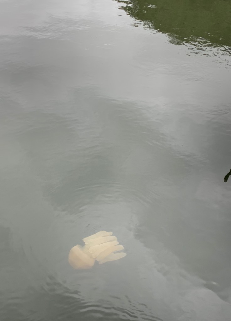 Tikėjosi, kad suėmus ji bus kaip mūsų šuo Marsas (na bus už ko laikyti), o tas šlapias padaras – dvigubai sunkesnis ir slidesnis, tokia sunki „sasiska“ su labai ilga uodega ir ilgais ilgais nagais. Pasisekė, kad ta „sasiska“ visiškai nesipriešino, tiesiog gulėjo visai be jėgų. Jonas ją surinko kaip kokį slime (LT slime lyg šlykš-tu-ku vadinasi 😄) ir vis pasitaisydamas, iš kelinto karto, užkėlė ant kranto. Sasiska su uodega nejudėjo, bet kvėpavo, o Jonas ją glostė glostė 💚 Aš kitame krante žliumbiau iš laimės, baimės ir dar kažko nesuvokiamo.