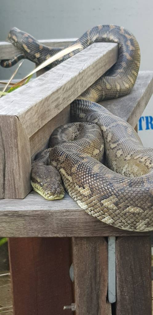 Šį kartą Jonas užmynė ne ant rajos, bet ant gyvatės. Užmynė ir nuėjo toliau. Gyvatė tikrai liko nesupratus, gerai, kad buvo maža 🧐, tik išsirietė ir nespėjo krimstelėti… aišku, kad buvo nuodinga (Eastern brown snake).